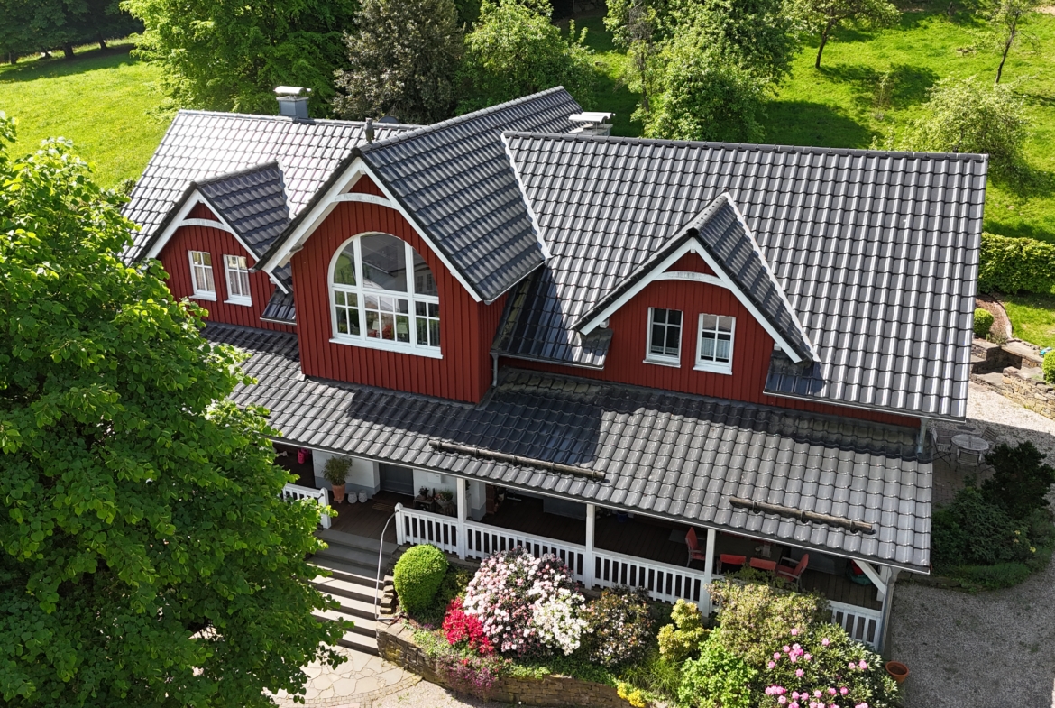 Zum Kauf wird hier eine skandinavische Villa in ländlicher Lage im oberbergischen Kreis angeboten. Das stilvolle Bauwerk fügt sich hervorragend in die Grünflächen ein und liegt im hinteren Drittel des 2.508 m² großen Grundstücks.